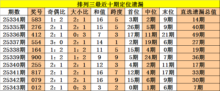 开奖回顾:排列三第2025343期奖号:012,定位直选遗漏值0期、1期、6期,遗漏总值为7期。