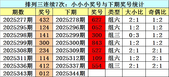 大小判断:上期排列三奖号为012,大小为:小小小,近7次大小为小小小的奖号为:432-124-141-300-234-114-412。