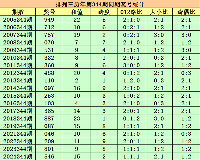 历史上第2025344期排列三已开出19期奖号了,历年同期奖号分别为:949、712、757、070、531、332、360、488、110、097、253、103、365、887、087、046、209、801、546,详细统计见下表: