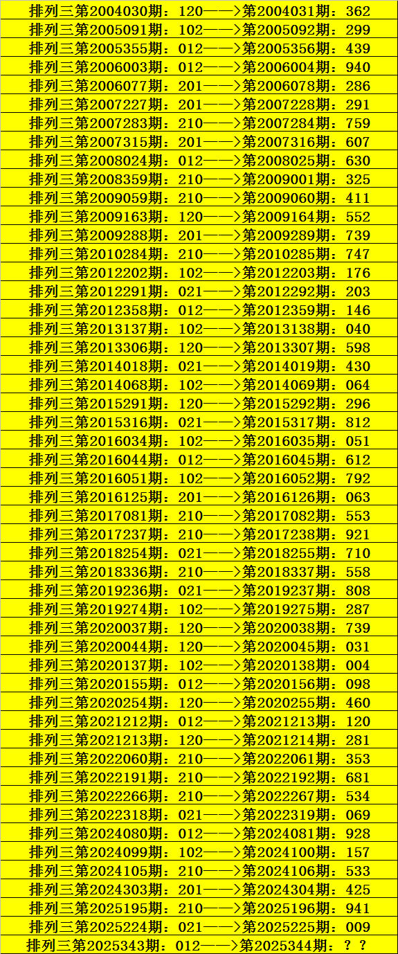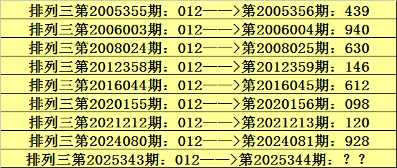 第2025343期排列三奖号为012,历史上该号码直选出现9次,下期奖号分别为:439、940、630、146、612、098、120、928。