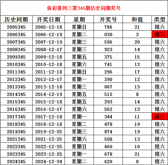 2025年12月25日排列三第345期开奖,历史同期分别开出奖号: