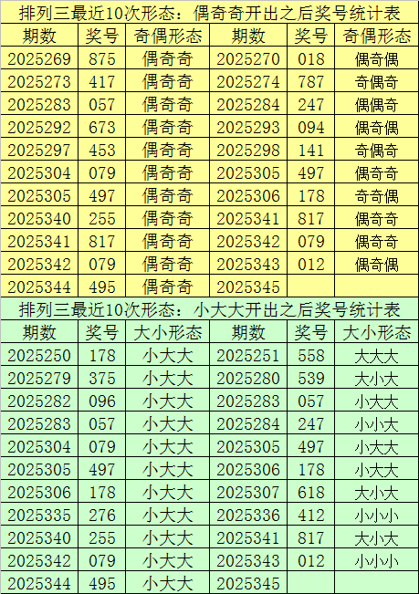 排列三最近10次同时开出奇偶形态:偶奇奇和大小形态:小大大时其奖号分别为:257-255-275-475-499-057-079-497-255-079-495,下期分别开出号码为:466-703-866-343-669-247-497-178-817-012,详细统计见下表: