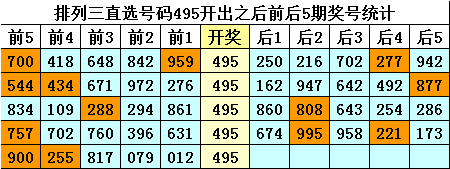 四、排列三直选号码495历史上开出5次,其前后五期奖号分别为: