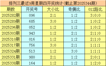 三、体彩排列三前9周星期四奖号分别开出:096-685-052-943-016-756-513-980-164,其中号码012路比为14:6:7,奇偶比为13:14,大小比为15:12;