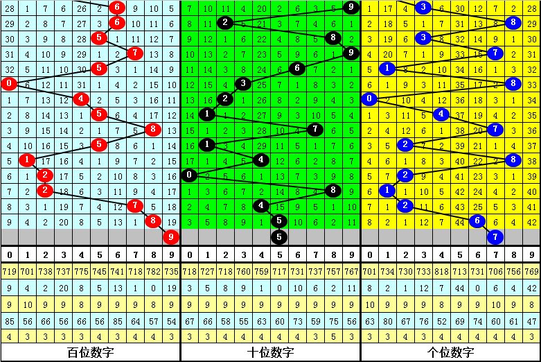 3、在以上0-9号码频次中,号码奇偶比为38:41,大小比为44:35,本期预计百位开出大号,参考号码9。