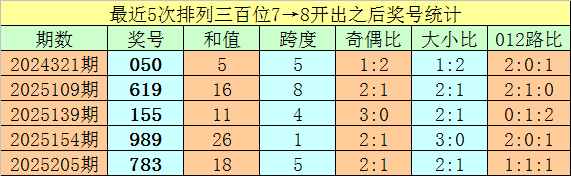 1、排列三最近两期百位号码分别开出7和8,历史上百位号码连续两期分别开出7和8的奖号出现了80期。前五期开出之后其下期奖号分别为:050、619、155、989、783;