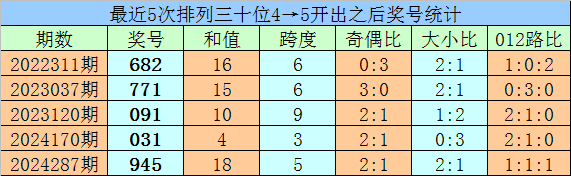 1、最近两期排列三十位号码开出号码分别为4和5,历史上十位号码连续两期同时出现号码4和5的奖号共开出66期。最近五次下期开出号码为:682、771、091、031、945;