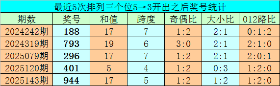 1、排列三前两期个位分别开出号码5和3,历史上个位号码连续两期分别出现5和3时,共有64次。在最近5次出现时,其下期分别出现号码:188、793、296、401、944;