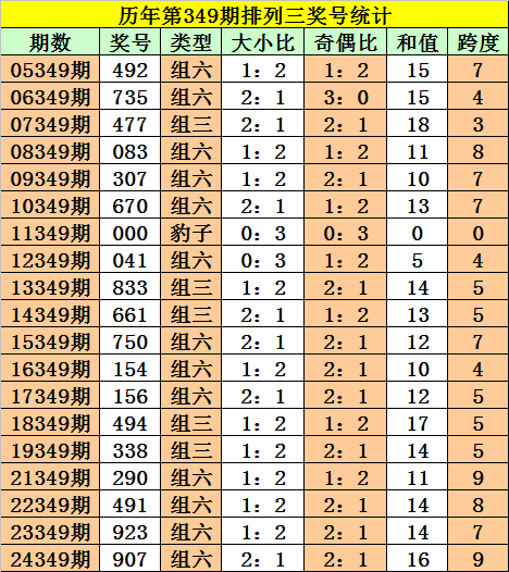历年第349期奖号:大小比为24:33,大号走冷,本期大号反弹,大小比参考2:1。