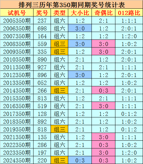 012路分析:历史上排列三第350期同期奖号中,012路奖号总个数比为22:11:24,012路奖号轮空期数比为2:10:2,今年第350期重防0路号码大热,注意出现全0路组合。