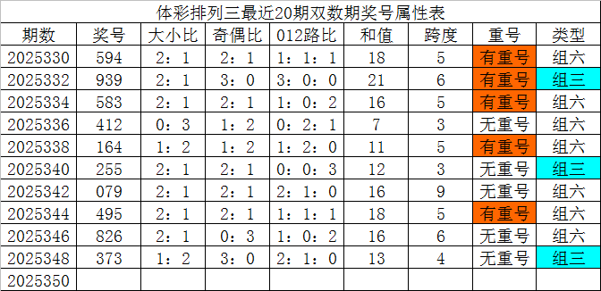 体彩排列三最近20期双数期奖号分别为:594、939、583、412、164、255、079、495、826、373,各期奖号详细属性下表: