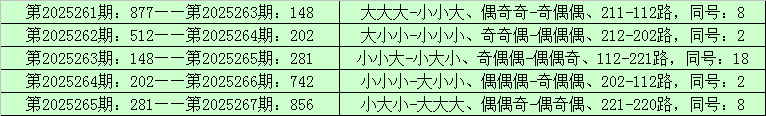 统计排列三已开出的奖号发现,在连续5期(第2025261期-第2025265)奖号为:877-512-148-202-281。