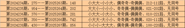 在排列三历史开奖中,第2024234期-第2024238期连续5期奖号为:275-954-376-356-430。