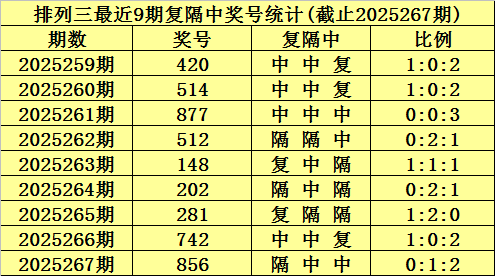 上期回顾:排列三第2025267期奖号为:856。大小比为3:0,奇偶比为1:2,012路比为1:0:2。