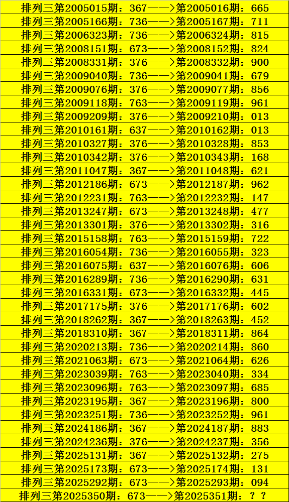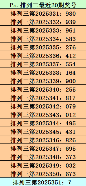 第2025350期排列三奖号为673,历史上该号码直选出现8次,下期奖号分别为:824、962、477、445、626、131、094。