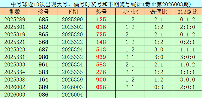 开奖回顾:体彩排列三第2026003期开出奖号086,奖号大小比开出2:1,奇偶比开出0:3,012路比开出2:0:1。