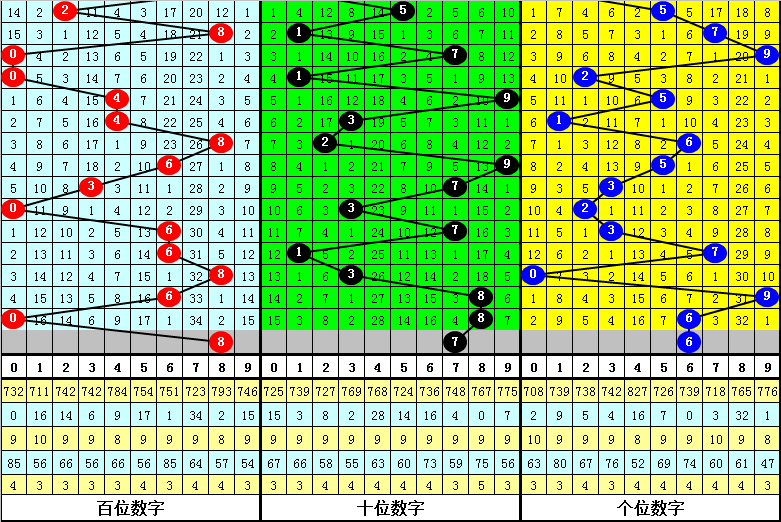 首号球:上期奖号为0,开出小 号、偶号,该位前10次开出小 号、偶号的现象时其奖号分别为:438、045、276、412、255、079、012、495、431、032,其中首号球012路比为4:4:2。