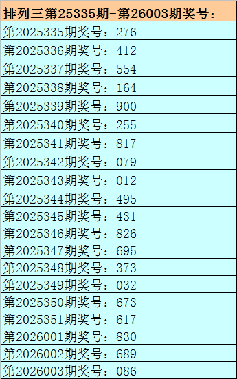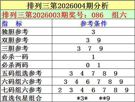 开奖回顾:排列三第2026003期开出奖号:086。其中奖号大小比为2:1,奇偶比为0:3,012路比为2:0:1,和值为14,跨度为8。