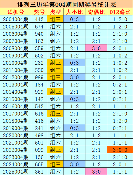 组选类型推荐:历史上排列三第004期同期奖号中,组六出现14期,组三出现8次,今年第004期注意组三号码。