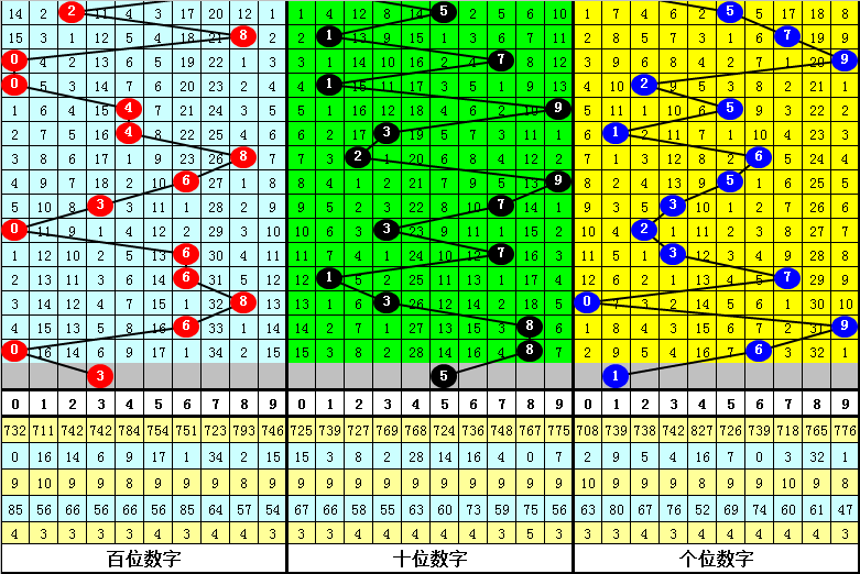 百位:上期开出0,偶数,奇号最近两周出现频次较低,遗漏6期,本期关注奇号,看好3。