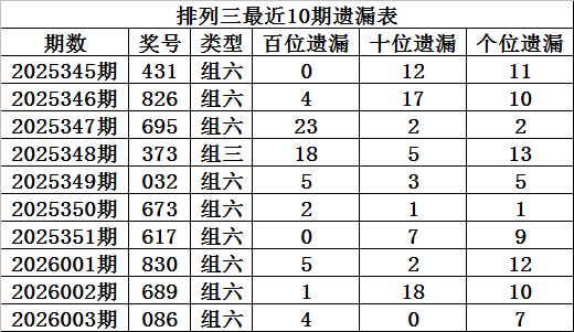 上期回顾:排列三第2026003期奖号:086,组六,直选遗漏总值为11期。