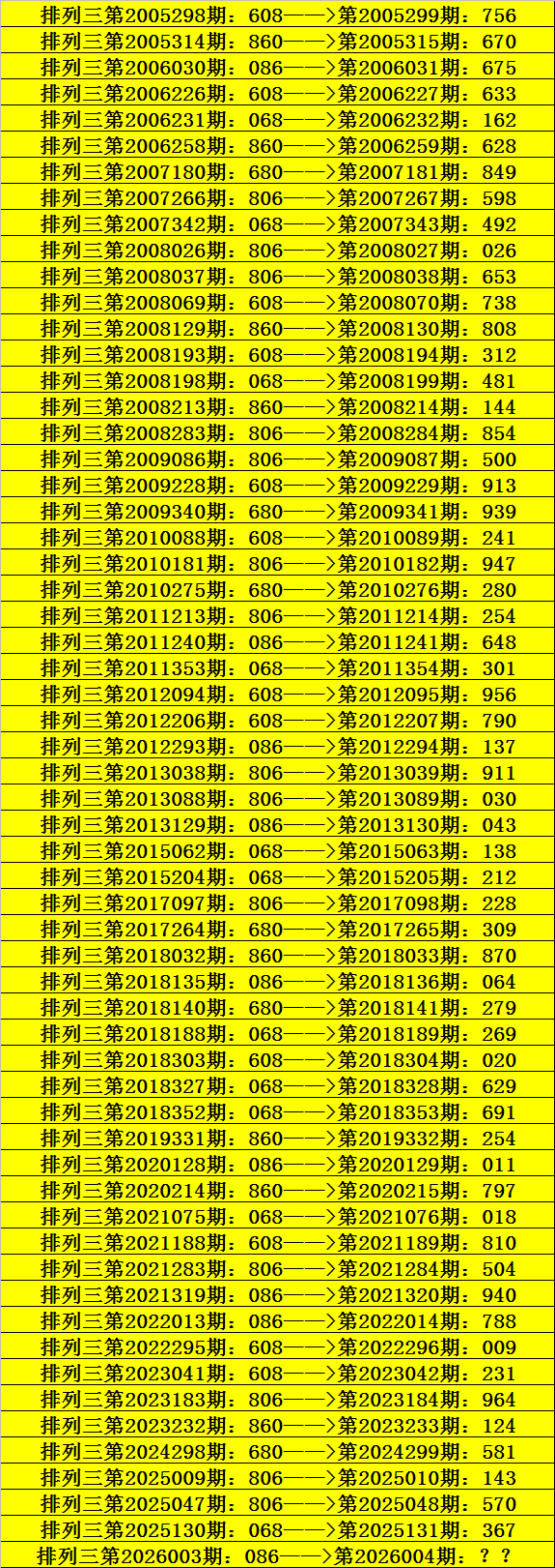 第2026003期排列三奖号为086,历史上该号码直选出现9次,下期奖号分别为:675、648、137、043、064、011、940、788。