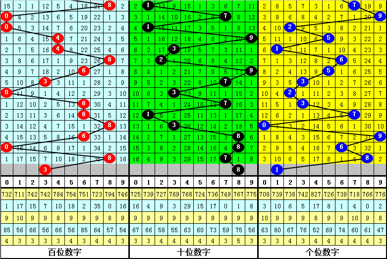百位:1、2路号较热,本期防0路号反弹,关注3。