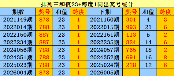 上期回顾:排列三第2026004期奖号:878。和值23,跨度1。