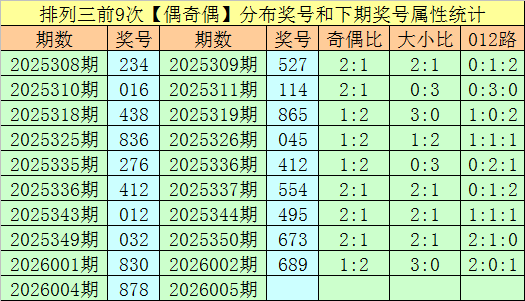 上期回顾:排列三第2026004期开出奖号878,类型为:偶奇偶、212路和大大大。