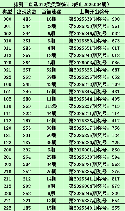上期回顾:体彩排列三第2026004期开出奖号:878,其012路比为0:1:2,奖号012路类型为:212。