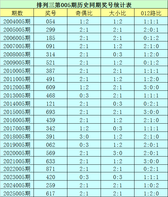 排列三第2026005期开奖日期:2026年1月5日,历史上第005期已开出了22次奖号,历年同期号码分别为:054、299、185、091、314、521、387、491、609、468、121、693、439、342、391、062、569、633、871、420、259、617。