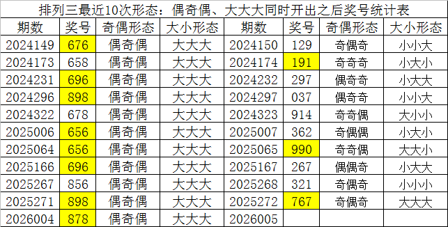 排列三最近10次同时开出奇偶形态:偶奇偶和大小形态:大大大时其奖号分别为:676-658-696-898-678-656-656-696-856-898-878,下期分别开出号码为:129-191-297-037-914-362-990-267-321-767,详细统计见下表: