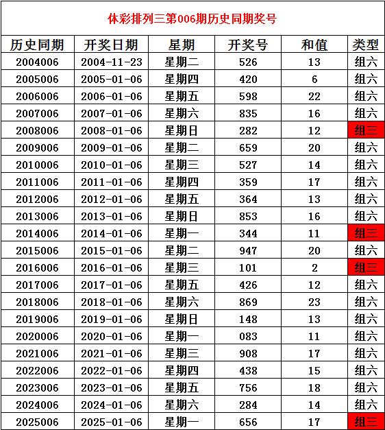 2026年1月6日排列三第006期开奖,历史同期分别开出奖号: