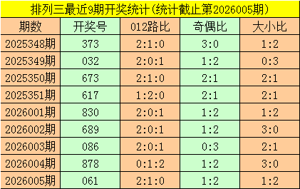 一、排列三第2026005期开出号码061,其奇偶比为1:2,大小比为1:2,号码012路比为2:1:0。该号码直选历史上出现了6次。