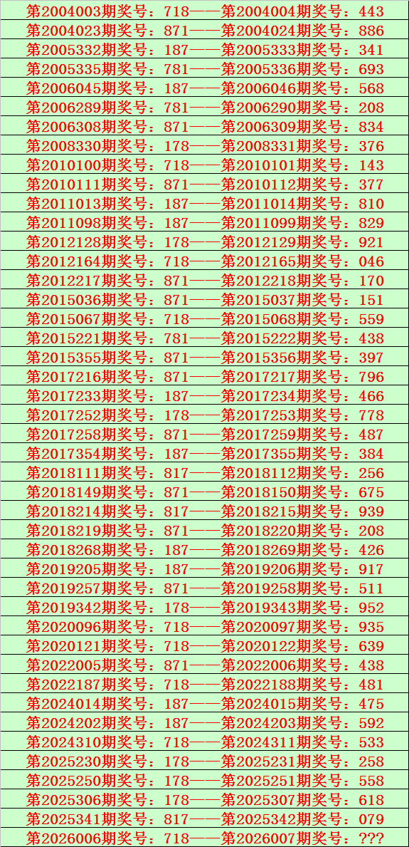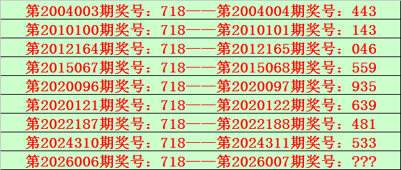 排列三第2026006期开出奖号718,该号码直选类型历史上出现了9次,前8次开出之后期下期奖号为:443、143、046、559、935、639、481、533,见下表: