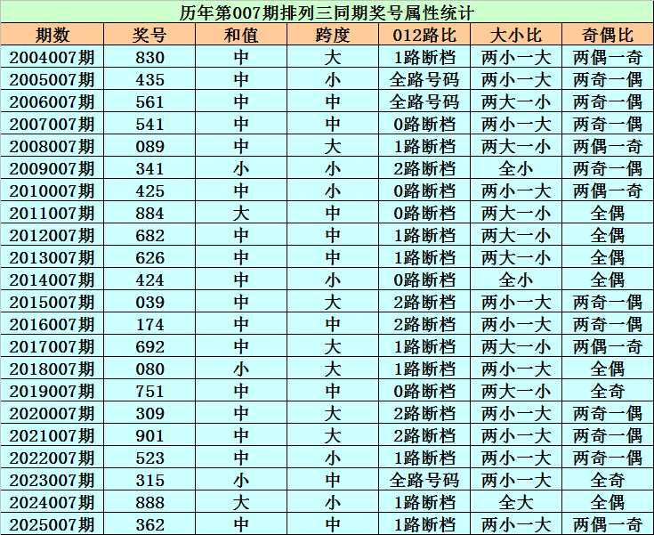 历史上第2026007期排列三已开出22期奖号了,历年同期奖号分别为:830、435、561、541、089、341、425、884、682、626、424、039、174、692、080、751、309、901、523、315、888、362,详细统计见下表:
