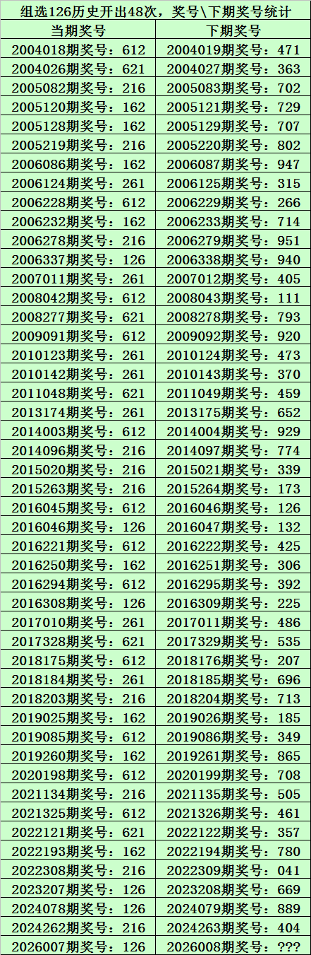 上期回顾:排列三第2026007期奖号为:126,类型:组六,历史上直选号码126出现了6次,组选号码126出现了48次。