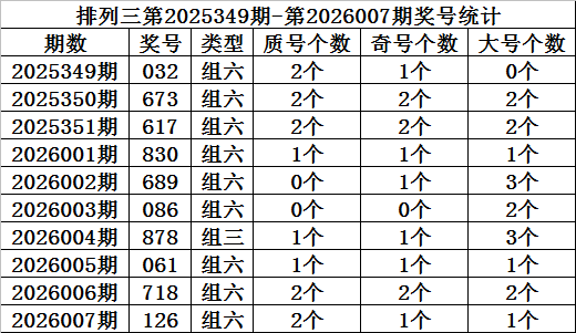 上期回顾:排列三第2026007期开奖:126,质合比为2:1,奇偶比为1:2,大小比为1:2。