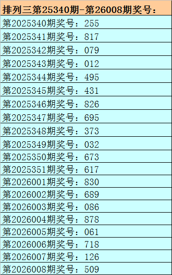 开奖回顾:排列三第2026008期开出奖号:509。其中奖号大小比为2:1,奇偶比为2:1,012路比为2:0:1,和值为14,跨度为9。