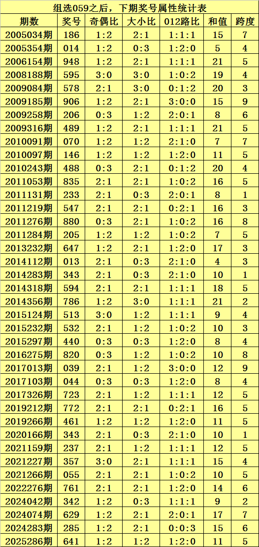 二、组选059分析:排列三历史上已开出40次组选号码059了,其奖号和下期开出奖号统计如下: