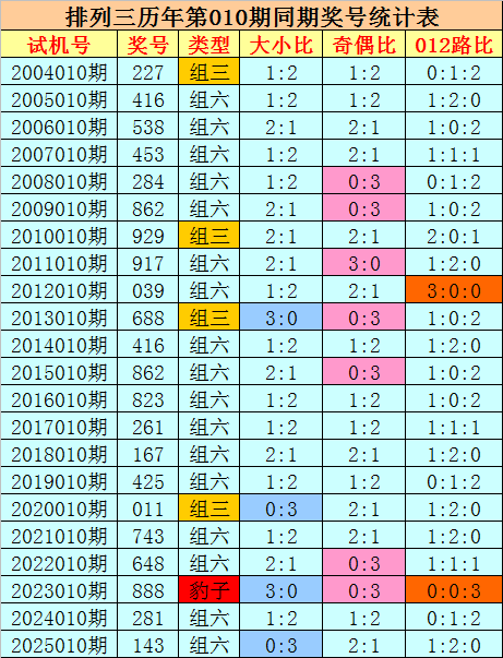 组选类型推荐:历史上排列三第010期同期奖号中,组六出现17期,组三出现4次,豹子出现1期,今年第010期预计奖号为组六号码。