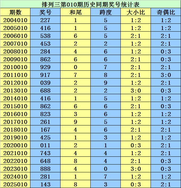 历年第010期排列三同期奖号开出:227、416、538、453、284、862、929、917、039、688、416、862、823、261、167、425、011、743、648、888、281、143。