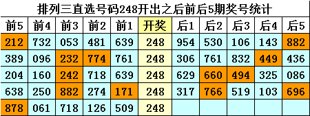 四、排列三直选号码248历史上开出5次,其前后五期奖号分别为: