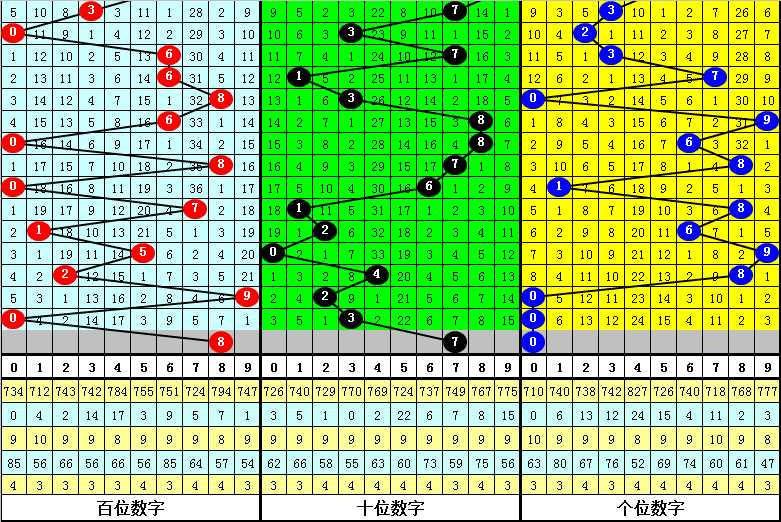 3.在以上9期奖号中,号码012路比分别开出1:0:2、3:0:0、1:1:1、0:1:2、2:1:0、0:1:2、1:1:1、1:0:2、2:1:0,012路出现个数比为11:6:10,本期预计开出012路比1:1:1。