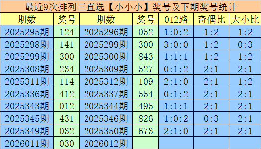 上期回顾:排列三第2026011期奖号为030,组三,大小比开出0:3,直选分布为:小小小。