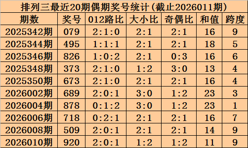 上期回顾:排列三2026011期奖号为030,奇偶比为1:2,大小比为0:3,跨度为3。