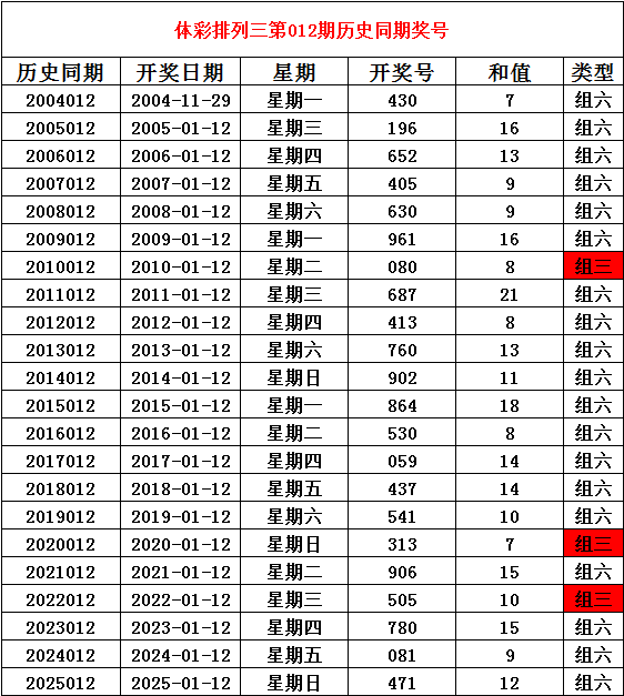 2026年1月12日排列三第012期开奖,历史同期分别开出奖号: