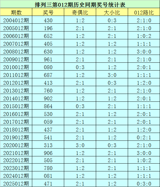 排列三第2026012期开奖日期:2026年1月12日,历史上第012期已开出了22次奖号,历年同期号码分别为:430、196、652、405、630、961、080、687、413、760、902、864、530、059、437、541、313、906、505、780、081、471。