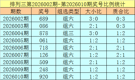 上期回顾:排列三第2026010奖号开出920,奖号质合比为1:2,大小比为1:2,跨度为9,类型为组六。