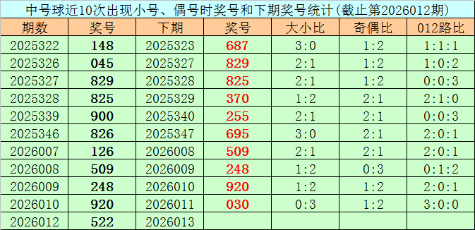 开奖回顾:体彩排列三第2026012期开出奖号522,奖号大小比开出1:2,奇偶比开出1:2,012路比开出0:0:3。